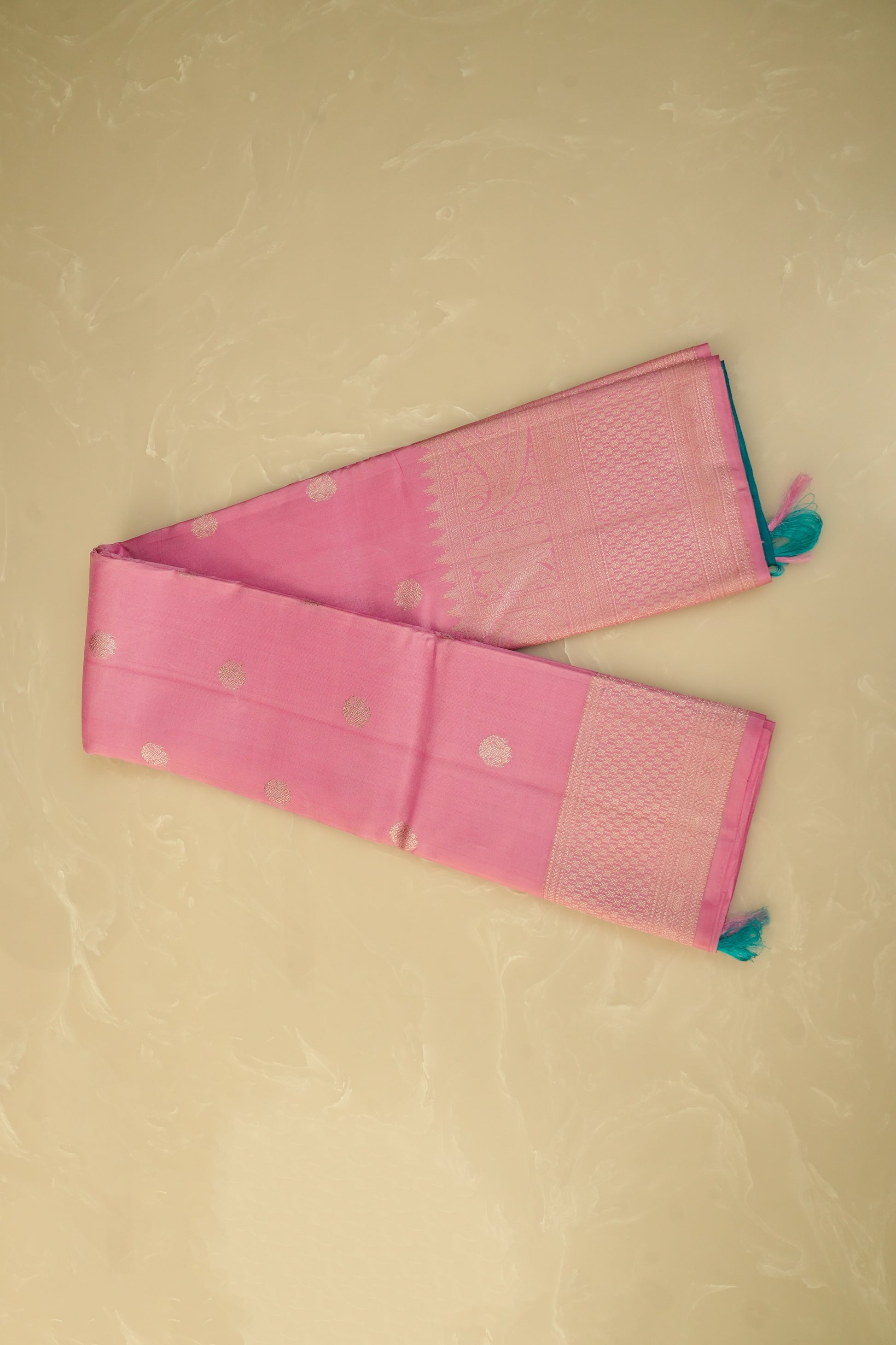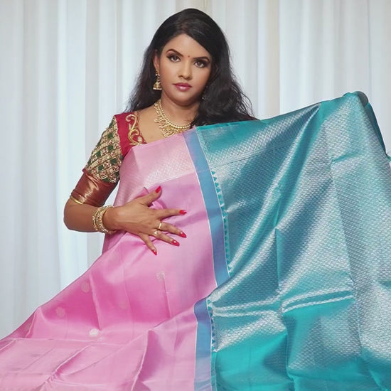 Kanjivaram Silk Saree โ Baby Pink & Teal Green With Rich Silver Zari Work