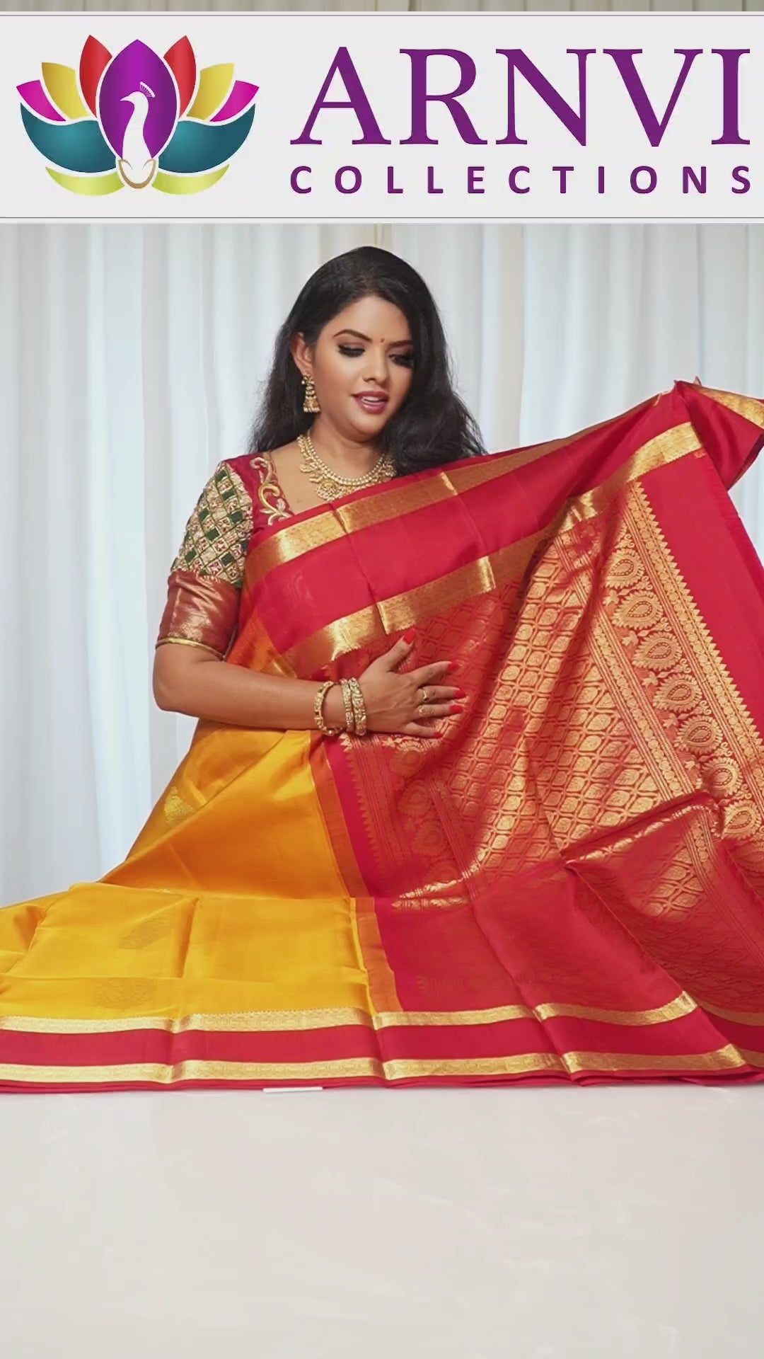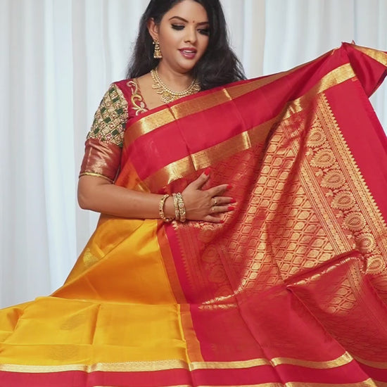 Kanjivaram Silk Saree โ Golden Yellow & Red With Rich Zari Work