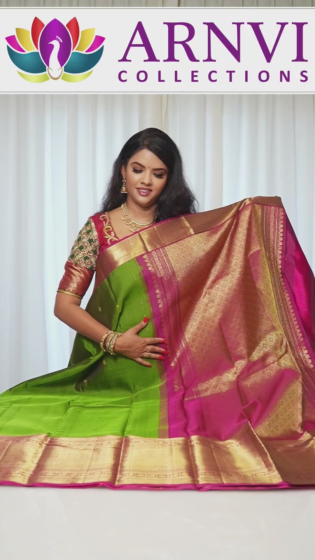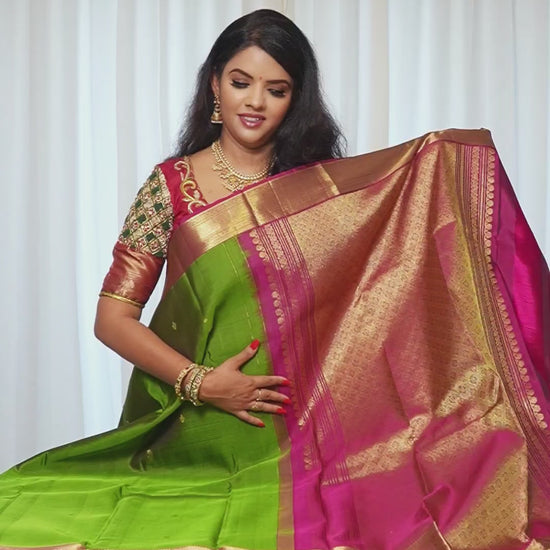 Color Combination: Vibrant Parrot Green body with a Contrasting Pink and Gold Zari Pallu and Border