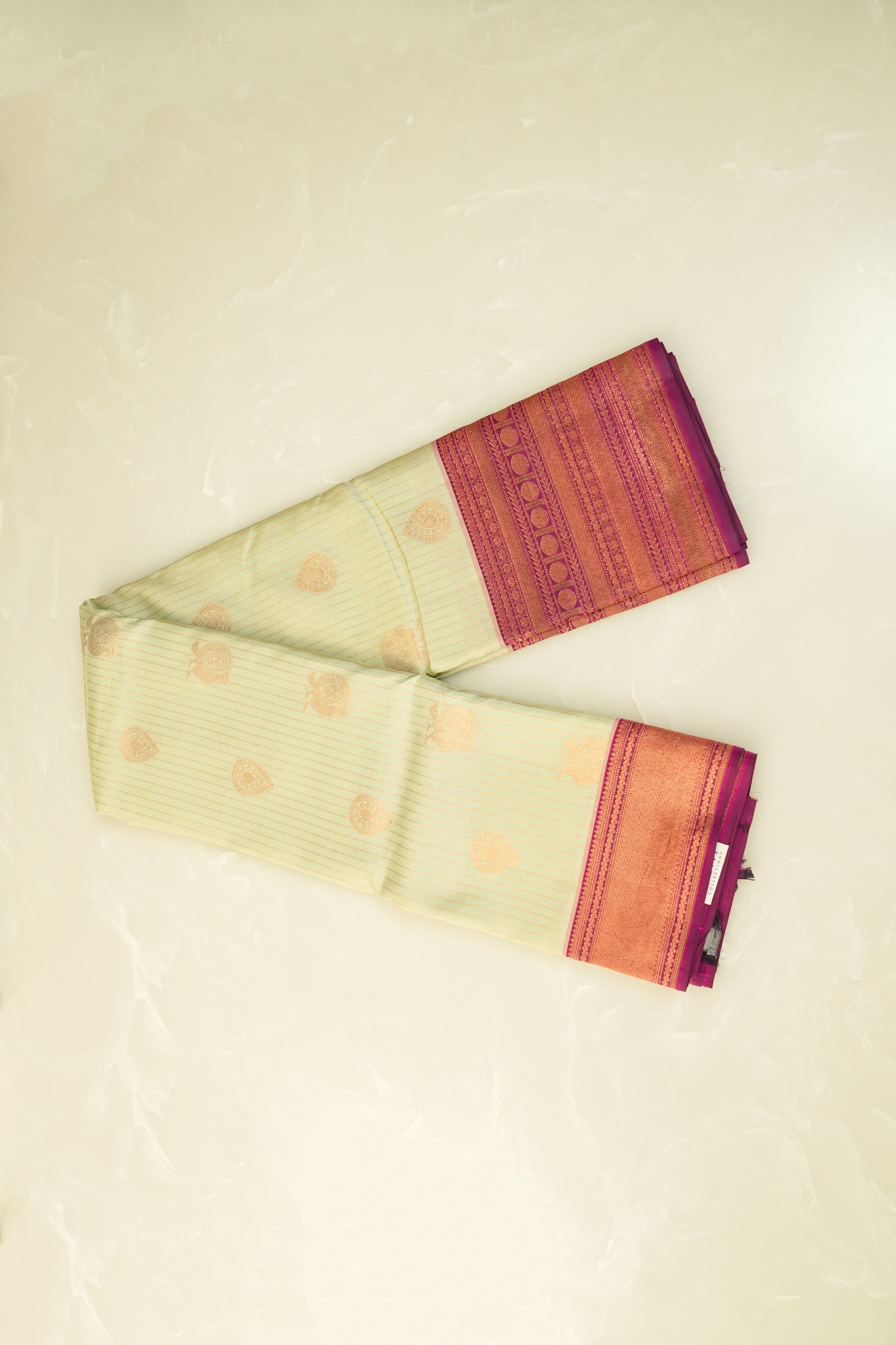 ๐ช Body: Subtle light pista green base adorned with delicate self-zari buttas in traditional motifs