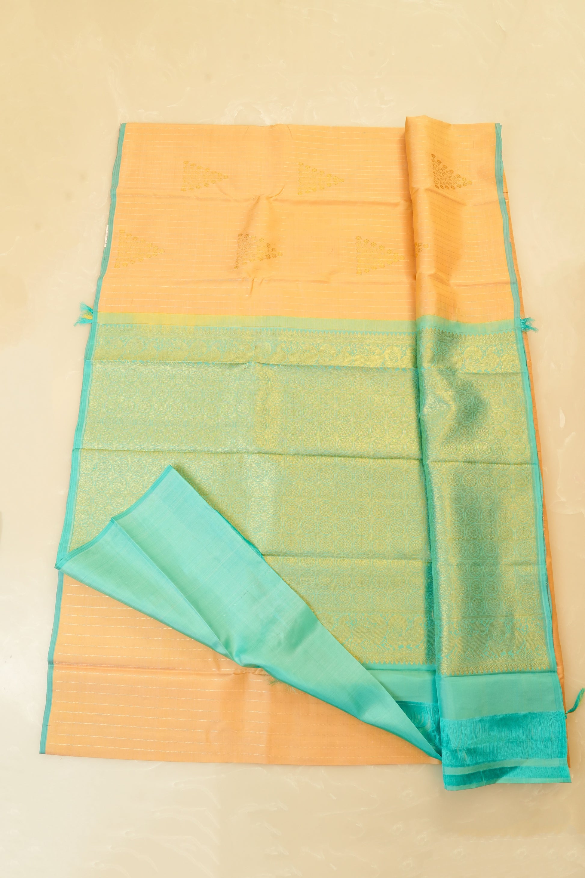 ๐ Borders: Grand golden zari borders with floral and paisley detailing on both sides