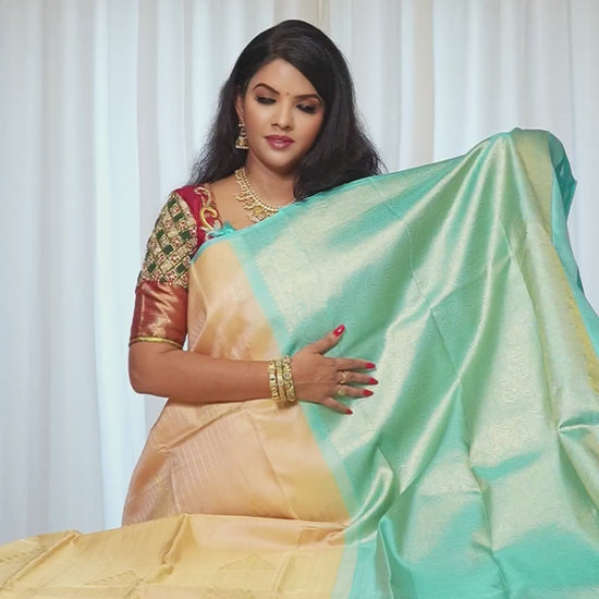 Kanjivaram Silk Saree โ Yellow & Sky Blue With Rich Gold Zari Work