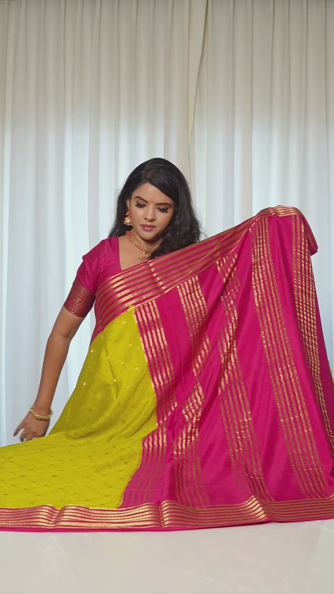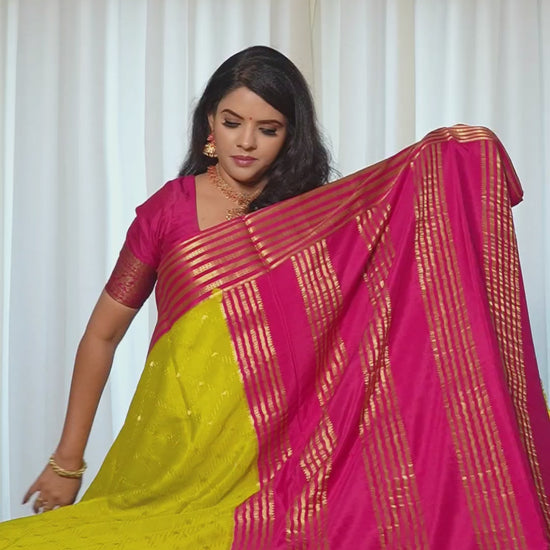 Pure Mysore Silk Lemon Yellow and Hot Pink Saree with Zari Border