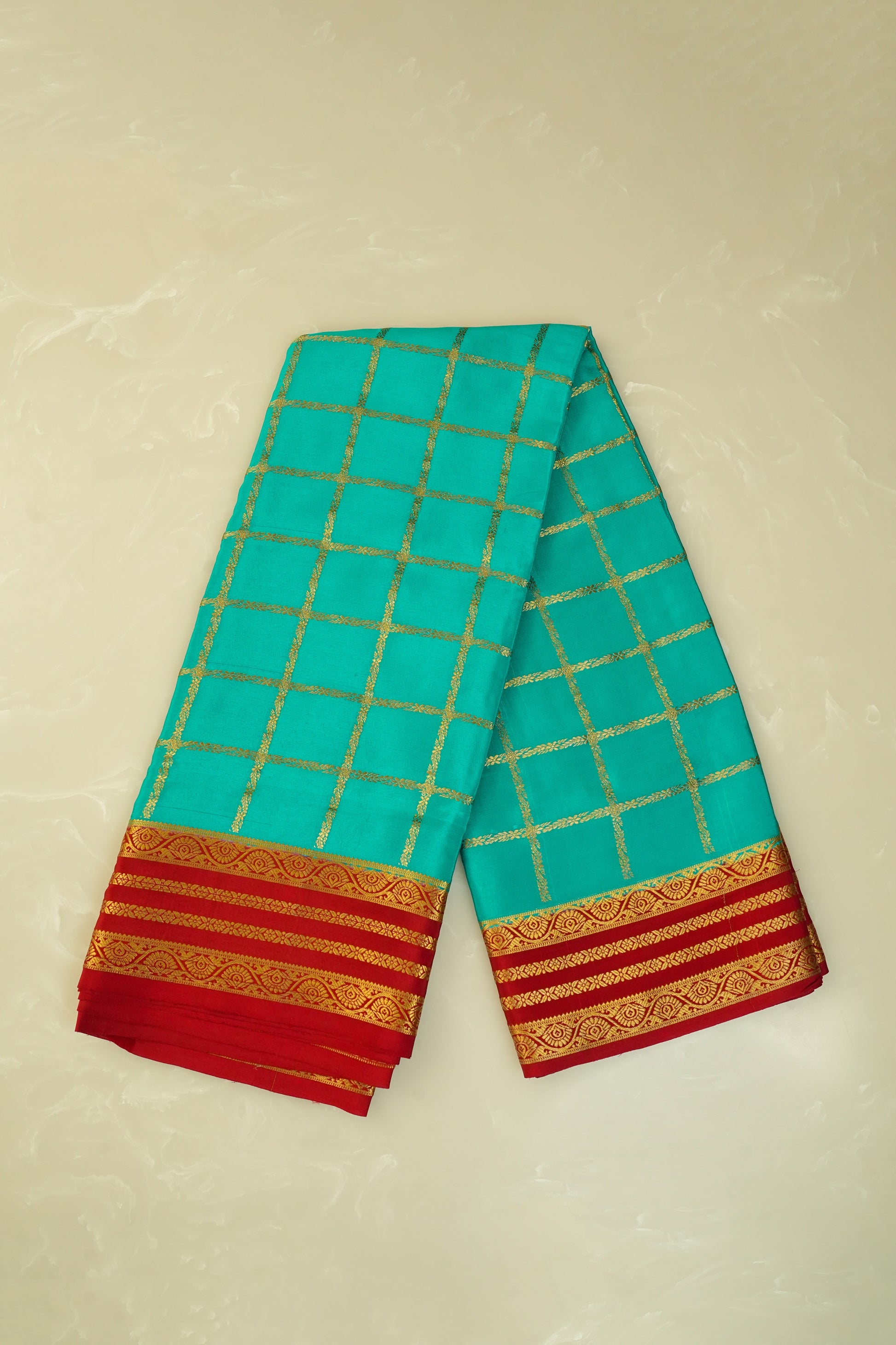 Pure Mysore Silk Teal Blue and Rich Red Saree with Zari Border